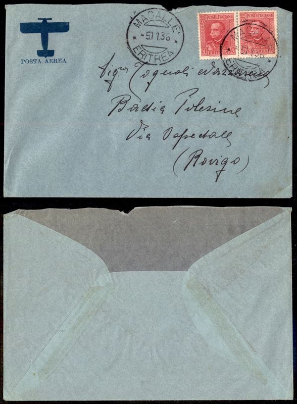 Macallè/Eritrea - coppia del 75 cent (200 Eritrea) su aerogramma per Rovigo del 5.11.38