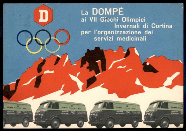 Olimpiadi di Cortina annullo a targhetta Sci di Fondo 30.1.1956 su cartolina pubblicitaria "La Dompè Farmaceutici" con 10 lire Cortina