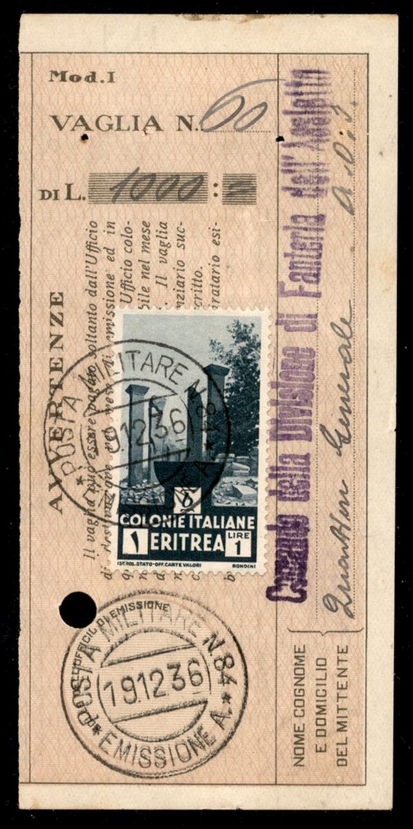 Posta Militare N. 84/Emissione A - 1 lira (209) su ricevuta vaglia del 19.12.36