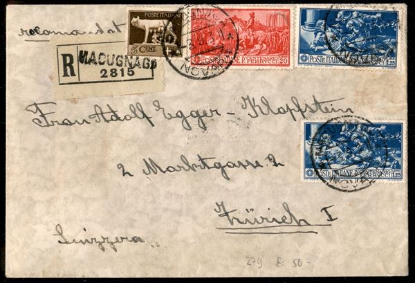 Raccomandata da Macugnaga 3.9.30 per Zurigo con Ferrucci due esemplari 1,25 lire azzurro + 20 cent carminio + Imperiale 5 cent bruno (243 + 276 + 279)