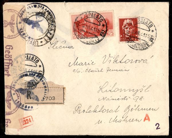 Raccomandata da Spalato 5.XII.412 affrancata con 2 lire carminio Imperiale + 75 cent carminio Fratellanza d'Armi (255 + 456) con bolli e fascette i censura