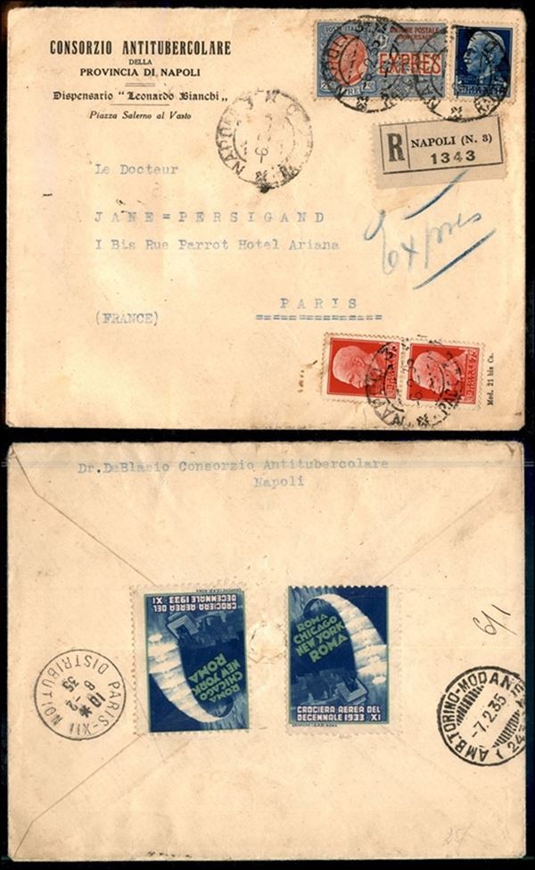 Raccomandata espresso affrancata con 2,50 lire Espresso (14) + complementari (252 due +253) da Napoli a Parigi del 6.2.35 - al retro due etichette Crociera Aerea