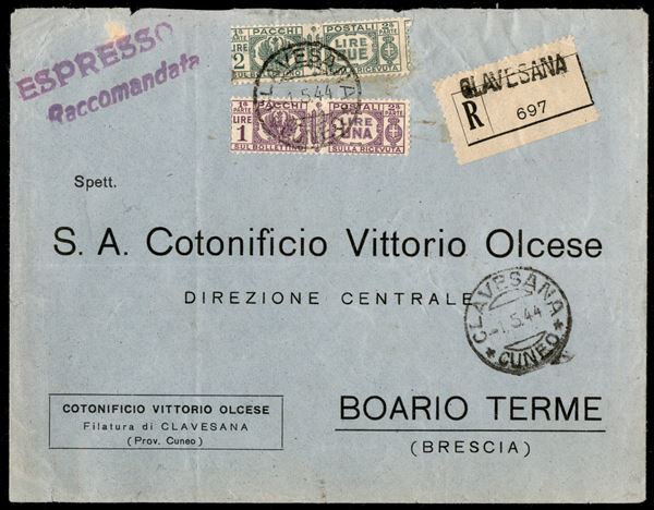 Raccomandata espresso da Clavesana del 1.5.44 per Boario Terme affrancata con 1 lira violetto + 2 lire verde Pacchi Postali (30/31) - fresca