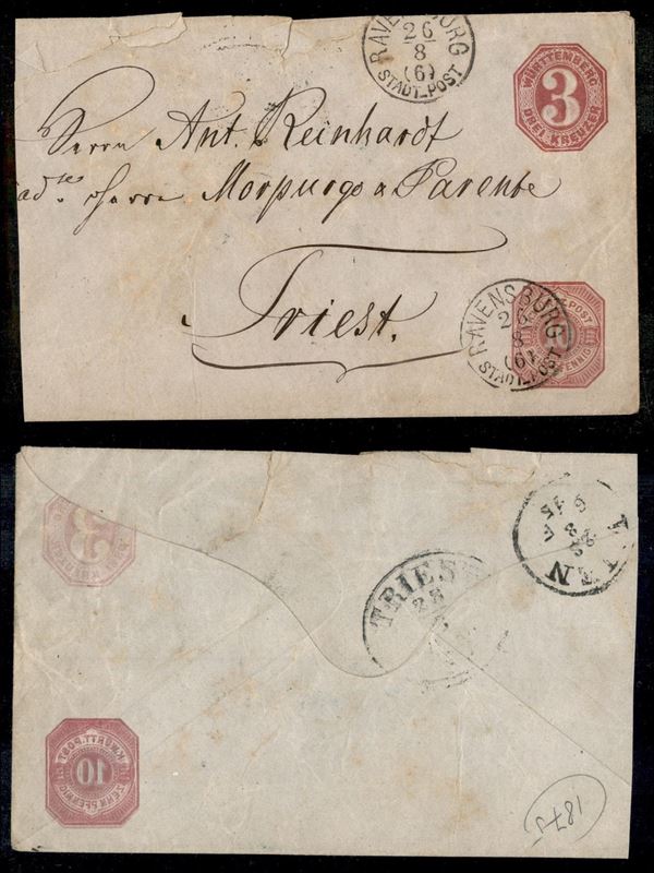 Wurttemberg - busta postale da 3 kreuzer + 10 pfennig da Ravensburg a Trieste del 26.8.75 - decalco al retro del 10 pfennig