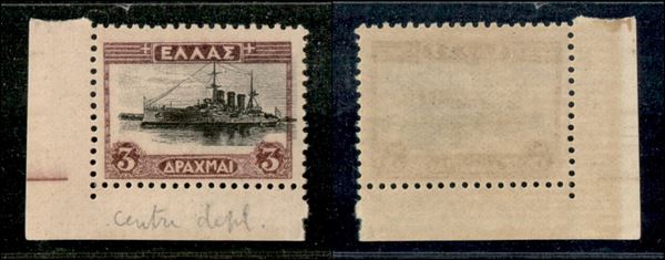 1927 - 3 dracme Corazzata Averov (313 I varietà) - centro spostato - gomma originale