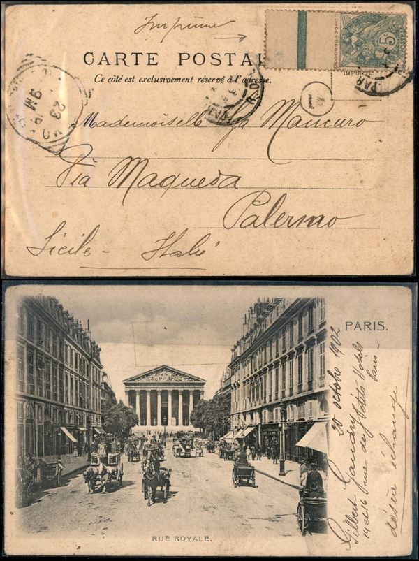 5 cent (90) bordo foglio con banda di colore - cartolina assicurata (Parigi Rue Royale) per Palermo del 20.10.09
