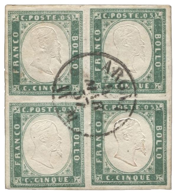 Blocco di quattro del 5 cent verde smeraldo con annullo centrale Arona 4.3.57 - ottimi margini - riprodotto sul Catalogo Enciclopedico Bolaffi 1983 tra le grandi rarità del settore - splendido - AD + Bolaffi + cert. ED + cert. Colla - (13D)