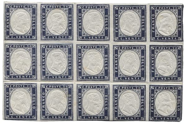 Blocco di quindici del 20 cent con due es. a filo in basso ed uno con punto chiaro - fresco - Bottacchi - (15E)