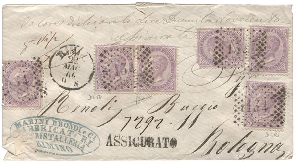 Busta assicurata da Rimini 22.5.66 affrancata con 4 es. (1 dif.) + coppia del 60 cent D.L.R. affrancatura di pregio - cert. Sorani - (L21)