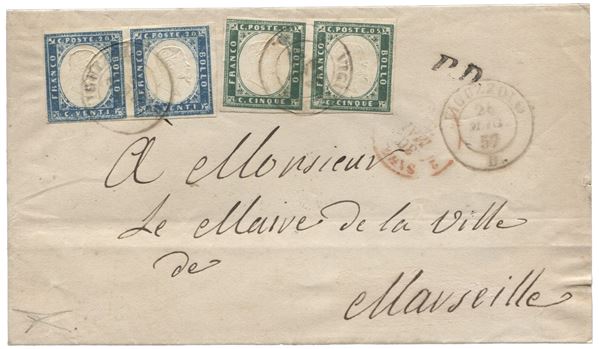 Circolare da Viguzzolo 26.5.57 (P.ti 8) per Marsiglia affrancata con coppia 20 cent cobalto scuro pił coppia 5 cent verde smeraldo scuro - buoni margini - splendida e rara tariffa multipla - cert. Bottacchi - (13f + 15b)