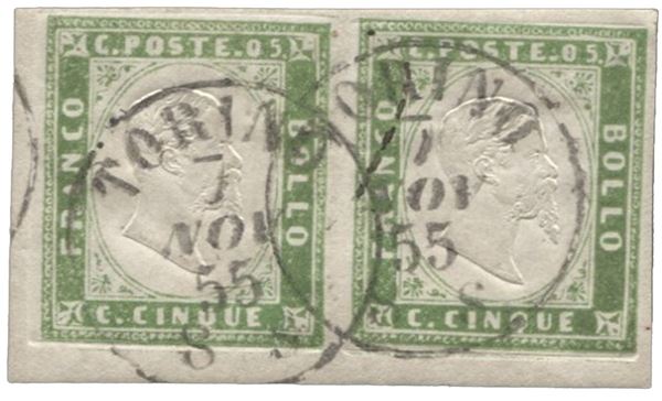 Coppia angolo di foglio del 5 cent verde giallo annullata Torino 7.11.55 - angolo di foglio - eccezionale - AD + ED + Raybaudi + Avanzo + Colla - (13a)