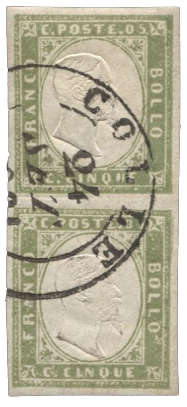 Coppia verticale del 5 cent verde chiaro annullata Colle in DC grande - ottimi margini - Bolaffi - (13Bb)