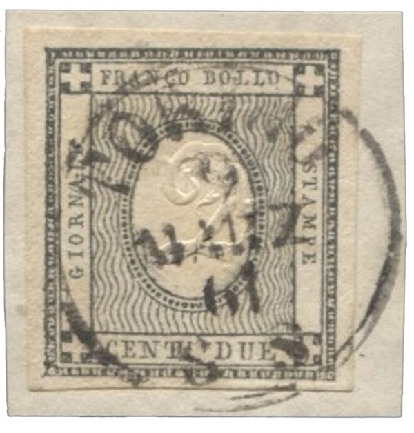 Frammento con 2 cent nero verdastro ottimamente marginato - Milano - AD + Bolaffi - (20c)