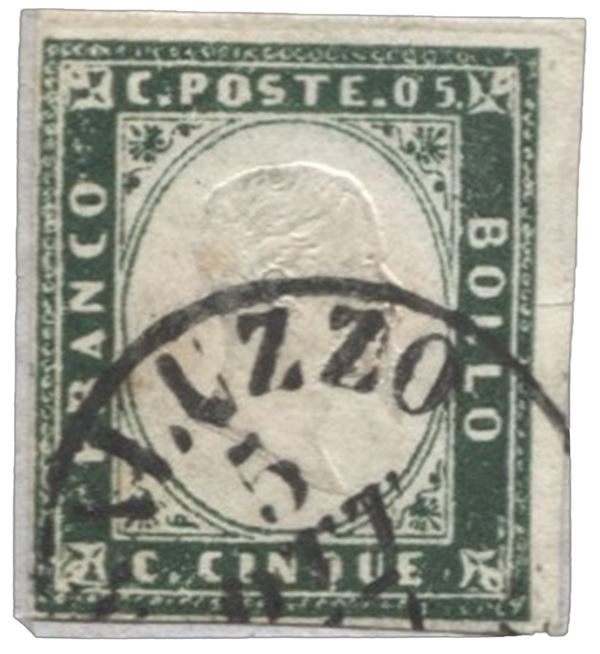 Frammento con 5 cent verde mirto scuro annullato Saluzzo - buoni margini - Bolaffi - (13Ab)