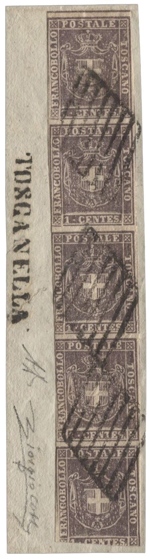 Frammento da Toscanella (SD in basso) recante striscia verticale di 5 del centesimo annullata con bollo a griglia - Cacciatori del Tevere - 2 note - GRANDE RARITA' - AD + cert. Colla - (A1)
