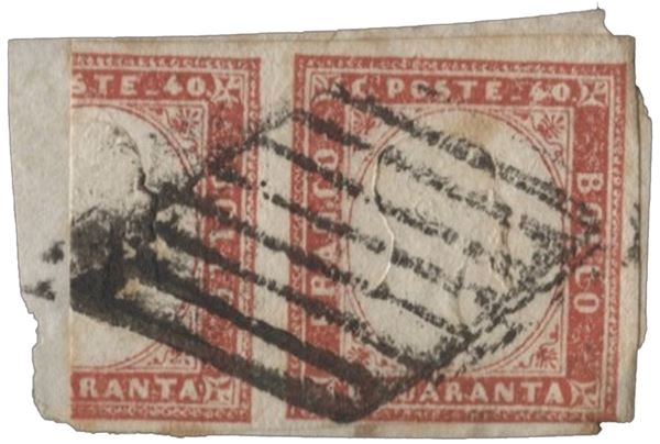 Frammento recante coppia del 40 cent rosso con l'es. di sinistra frazionato verticalmente a metà - annullo passante a griglia - 2 noti - di notevole rarità - cert. ED - (16C)