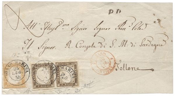Fronte di lettera da Diano Marina 25.7.58 recante 80 cent ocra arancio pił coppia 10 cent terra d'ombra (leggera piega su es. di destra) - ottimi margini - AD + ED + RD + Raybaudi - (17b + 14)