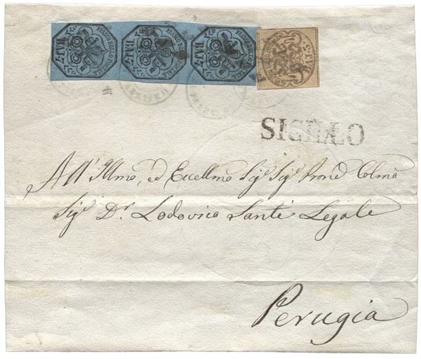 Frontespizio di lettera affrancata con striscia di tre verticale del 7 pił 3 baj fortemente oleoso - buoni margini - Posta di Fabriano in azzurro e riannullata a sigillo con muto a rombi - LG - (8 + 4e)
