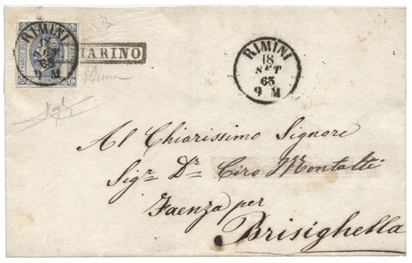 Lettera affrancata con 15 cent Litografico Italia bene marginato annullato sia con bollo Rimini 18.9.63 che S. Marino in cartella - l'esemplare presenta la varietà serpentello all'angolo superiore sinistro - unico documento noto - Em.D + Raybaudi + cert. ED + cert. Bottacchi - (A10da)
