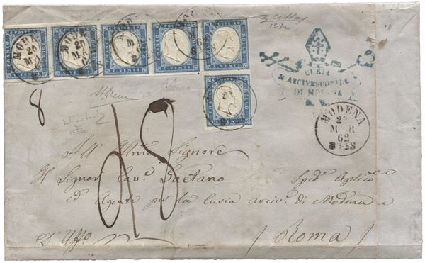 Lettera da Modena 20.3.62 affrancata con blocco di 6 a seggiola del 20 cent - interessante doppia stampa visibile su ogni esemplare bene marginata ed applicata su piega preesistente - rarità - Em.D + Colla + cert. AD + cert. Raybaudi - (15Da)