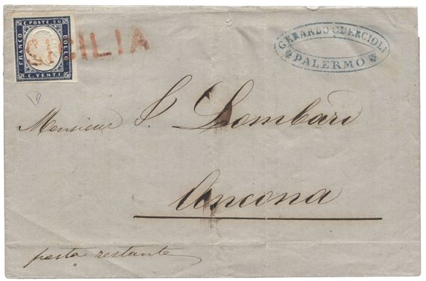 Lettera da Palermo 25.6.62 per Ancona affrancata con 20 cent bene marginato annullato in transito Sicilia SD in rosso (P.ti 9) - ED - (15E)