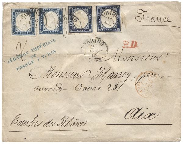 Lettera da Torino 28.7.62 per la Francia affrancata con quattro es. del 20 cent di cui due di gradazione celeste e due indaco - qualche imperfezione ma raro insieme - (15Da + 15E)