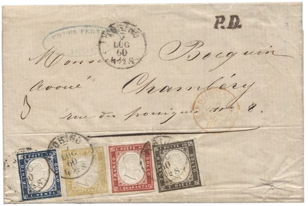 Lettera da Torino 7.7.60 affrancata con 20 + 80 + 40 e 10 cent - tariffa di triplo porto per la Francia - 40 e 80 cent con ampi margini - RARA QUADRICOLORE D'EFFETTO - Bottacchi - (15Ba + 17Aa + 16C + 14Bb)