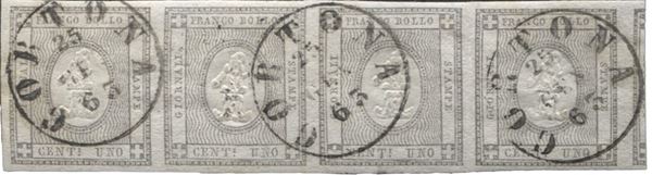 Striscia di 4 del centesimo grigio chiaro - grandi margini - Cortona 25.1.63 - Bolaffi - (19d)