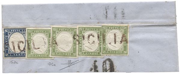 Testata di lettera con parte del verso recante un 20 cent + 4 es. del 5 cent tutti annullati in transito a Napoli con SD rosso Sicilia - insieme non comune d'effetto - Sorani - (15Dc + 13Cc)