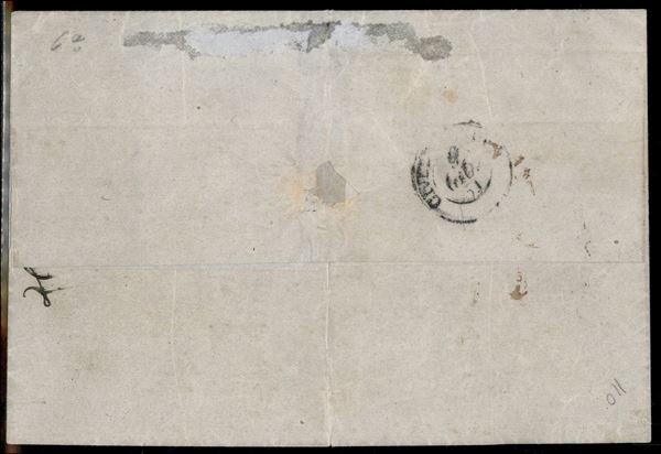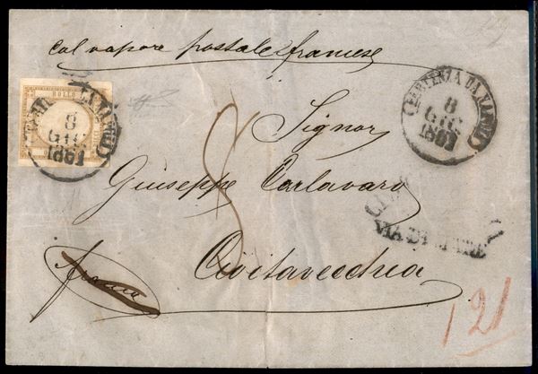 10 grana bistro oliva (22b - perfetto) su sovracoperta di lettera da Napoli 8.6.1861 a Civitavecchia - tassata 8 bajocchi - Firma A.Diena