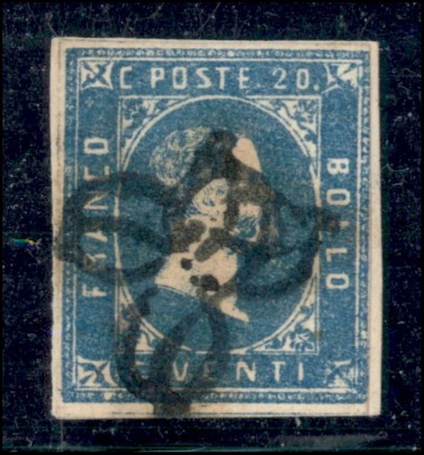 1851 - 20 cent azzurro chiaro I° riporto (2f) su piccolo supporto cartaceo con buoni margini - a filo in alto a destra - doppio annullo a nodo di Savoia - raro