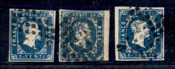 1851 - Lotto di tre esemplari del 20 cent azzurro (2) tutti di ottima qualità - firmati Chiavarello