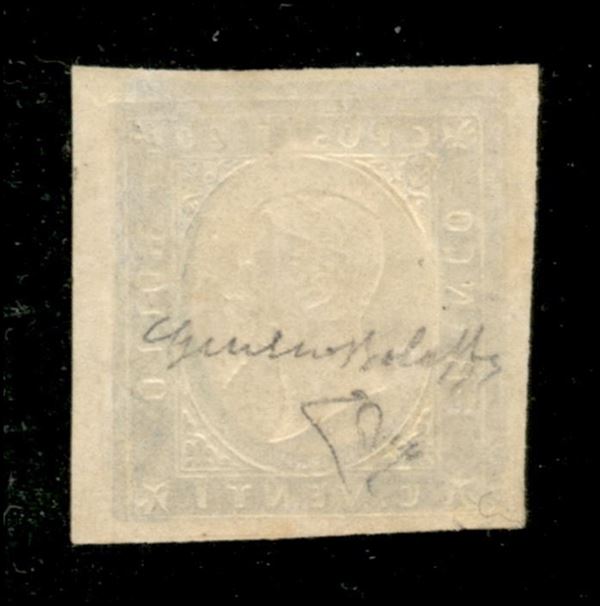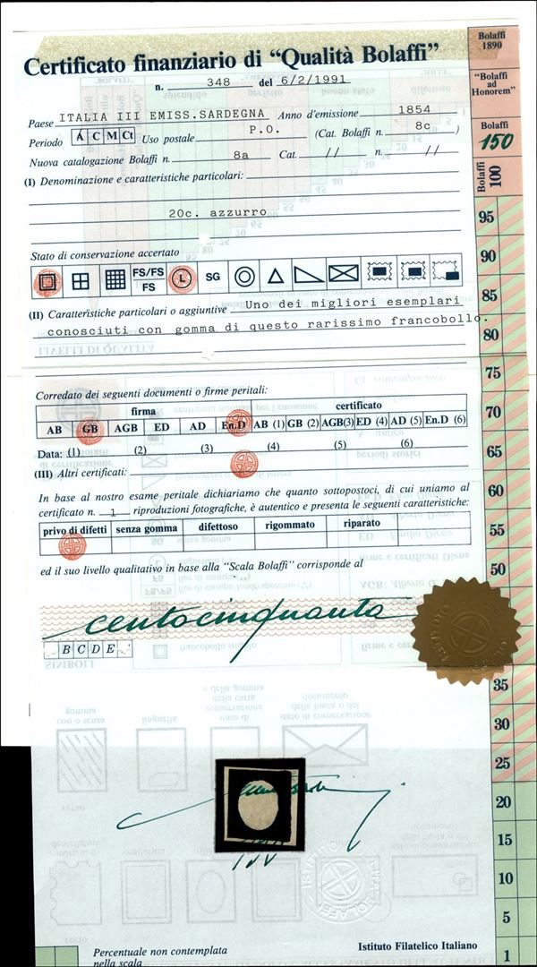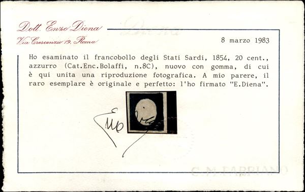1854 - 20 cent azzurro (8 cat.40000) - bordo di foglio - nuovo con gomma originale - cert. Enzo Diena + Bolaffi 150%