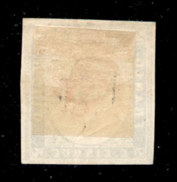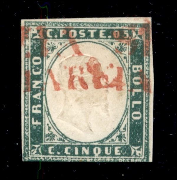1855 - 5 cent verde smeraldo grigiastro (13g) con annullo rosso su due righe "Via di mare" - leggermente a filo in basso - molto interessante e bel colore