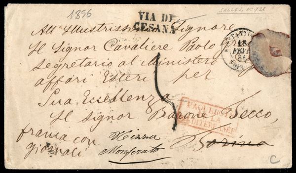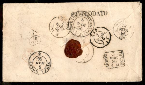 1856 - Bustina da Costantinopoli a Torino transitata per via di Francia con bollo "Paquebot de la mediterranee" in rosso + lineare "Via di cesena" su due righe - rispedita a Nizza Monferrato - interessante