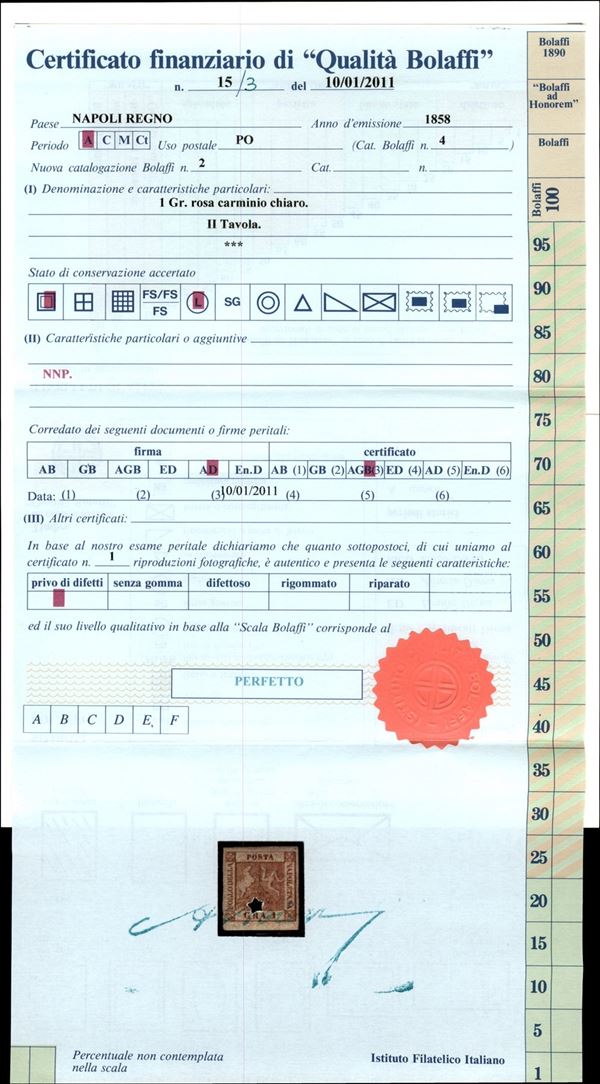 1858 - 1 gr. rosa carminio IIa Tavola (4 cat. 2.200) - bellissimo esemplare fresco di colore e di gomma e ben marginato - firma AD + cert. Bolaffi