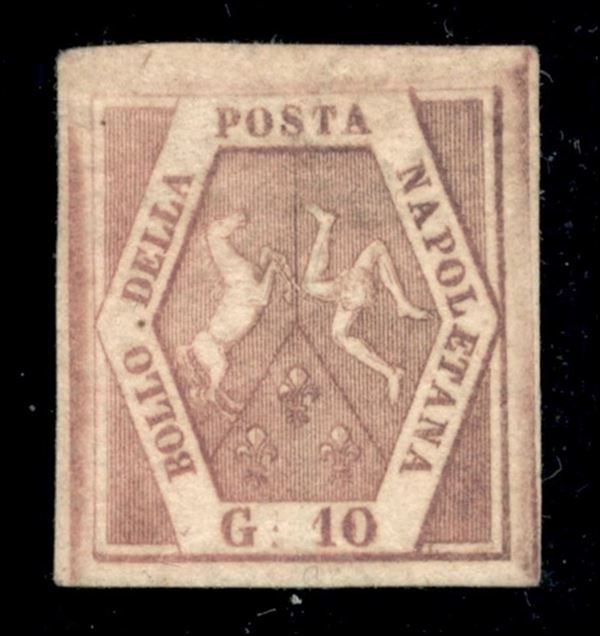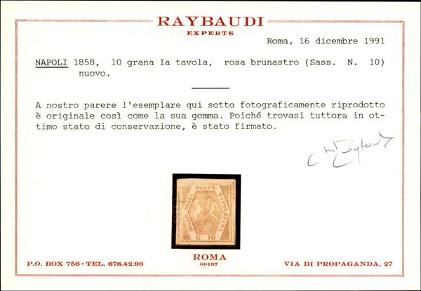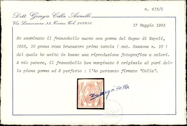 1858 - 10 grana rosa brunastro I tavola (10 cat.26000) - nuovo con gomma originale - cert. Colla + Raybaudi