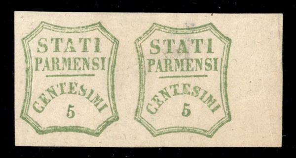 1859 - coppia orizzontale del 5 cent verde giallo (13) - nuovo con piena gomma originale - esemplare di destra con bordo di foglio assottigliato