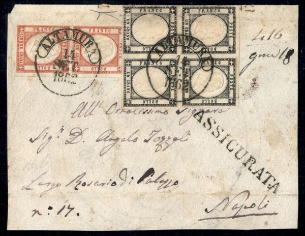 1861 - blocco di quattro del 1 grano nero + coppia verticale del 5 grana vermiglio (19 + 21a) con minime imperfezioni su frontespizio di lettera assicurata da Altamura 14 SETT 1862 a Napoli - insieme molto raro e di ottimo aspetto - firma Em.Diena + cert. Bottacchi