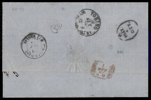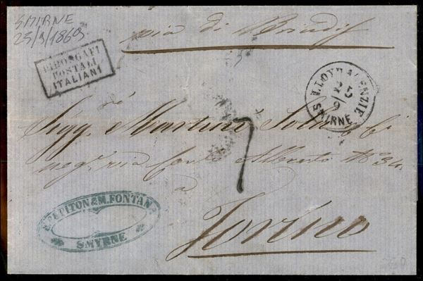 1869 - Lettera per Torino via Brindisi con bollo austricao Lloyd Agenzie Smirne 25/9 e bollo in cartella "Piroscafi postali italiani"