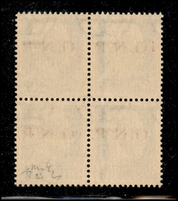 1943 - 1,25 lire (480/Ihcc) - quartina con soprastampe spostate - gomma integra - ottimamente centrata - Chiavarello