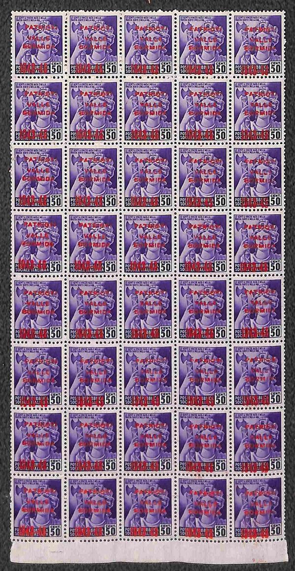1945 - 50 cent soprastampe in vermiglio (5A) - blocco di 40 (posizioni 11/50) - gomma integra - raro insieme - Cert oro Raybaudi