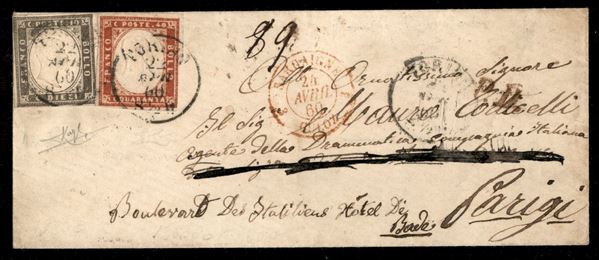 Bustina affrancata con 10 cent bruno grigiastro + 40 cent vermiglio mattone (14Bd + 16Ba) da Torino 22 APR 60 per Parigi - cert Raybaudi Luigi