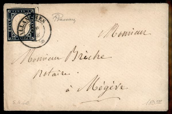 Bustina affrancata con 20 cent azzurro scurissimo (15C) quasi nero - tinta estrema molto rara - ben marginato e con filetti laterali - da Sallanches 5 AVRL.60 per Megeve