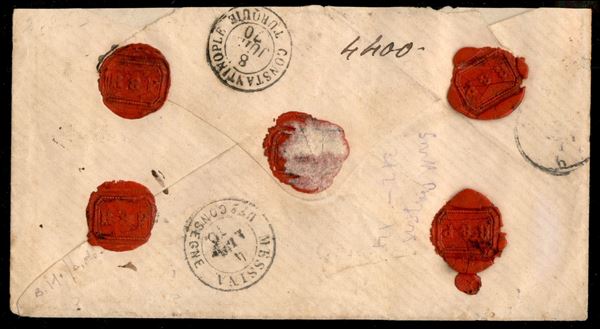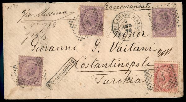 Bustina raccomandata per Costantinopoli affrancata con 40 cent rosso carminio + tre esemplari del 60 cent lilla (20 + 21) annullati con bollo numerale a punti 55 da Castellamare di Stabia 3 LUG.70 - transitata per via di Messina