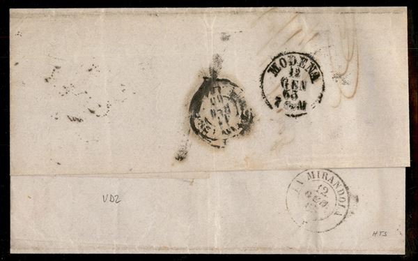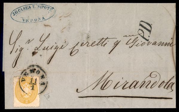 Circolare affrancata con 2 soldi giallo (36 cat.1000) da Verona 11/1 del 1863 per Mirandola - ex collezione Milani