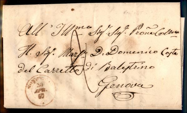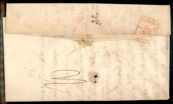 Doppio cerchio Montoggio 29 APR.57 (R3) i rosso su lettera con tassa "2" per Genova - obliterazione molto rara