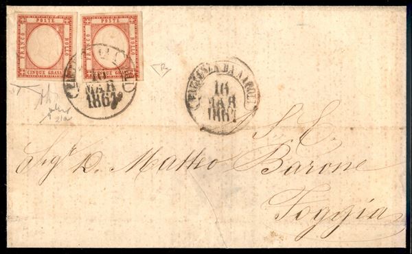 Due 5 grana vermiglio (21a - perfetti) su sovracoperta di lettera porto multiplo da Napoli 16.3.1861 (annullo rossastro) a Foggia - Rara lettera risalente all'ultimo giorno delle province napoletane - Firme A. + E.Diena + Chiavarello + Bottacchi