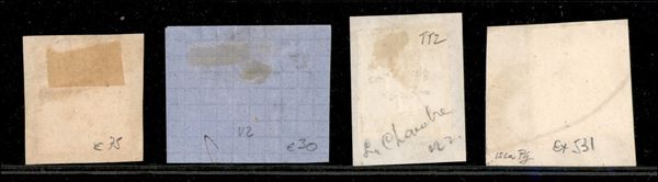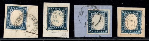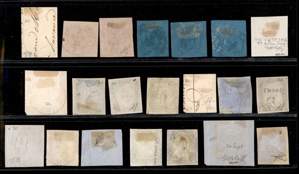 Eccezionale insieme di 25 esemplari usati e su frammento con annulli di Savoia - notate alcune impronte molto rare "Ruffieux" "La Motte" su II emissione "La Chambre" in azzurro su IV emissione e molto altro - qualità molto interessante