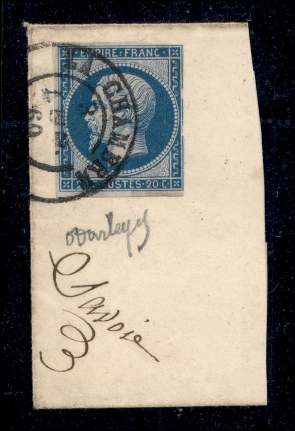 Frammento con annullo di fornitura sarda di Le Chambre 30 LUG.60 (p.ti 12) su valore di Francia da 20 cent azzurro - raro